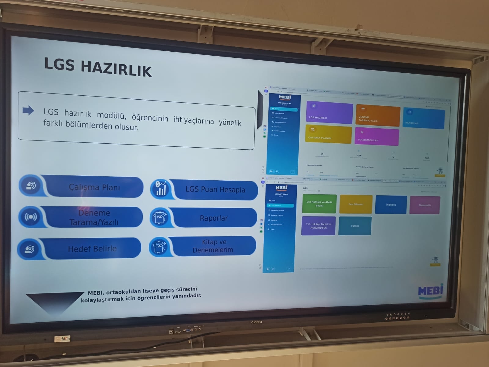 İlçemiz genelindeki tüm ortaokullarda, MEBİ platformunun tanıtımı ve aktif kullanımının yaygınlaştırılması amacıyla okul idareleri, rehber öğretmenler ve bilişim teknolojileri öğretmenleri öncülüğünde bilgilendirme toplantıları düzenlenmiştir. Ayrıca öğrencilerin platforma erişim sağlayabilmeleri için sınıf içi tanıtımlar, pano duyuruları ve veli bilgilendirmeleri gerçekleştirilmiştir.
